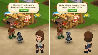 A primeira vez que você se colete do seu galinheiro, você receberá um ovo exótico. Ovos exóticos permanecerão na sua fazenda em uma maneira similar às culturas adubadas e serão adicionados à sua coleção. Depois cada dia você vai ter uma chance para receber ovos mais exóticos.